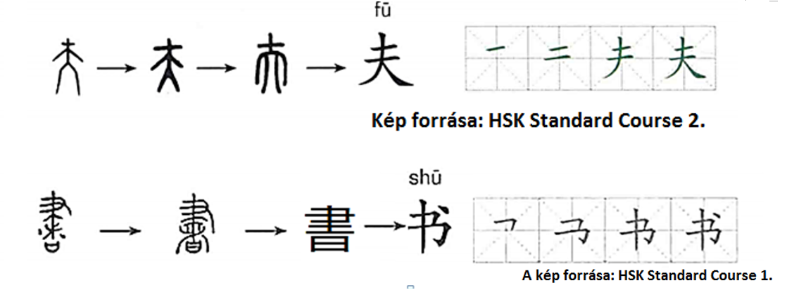 - kép: A második képen az írni (ma kínaiul könyvet is jelent) írásjegyét látjuk. Itt egy ecsetet fogó és tusos tálba mártó kezet látunk, a kínaiak ugyanis a Han-dinasztiától kezve, amikor a papírt feltalálták, ecsettel írtak, festettek.