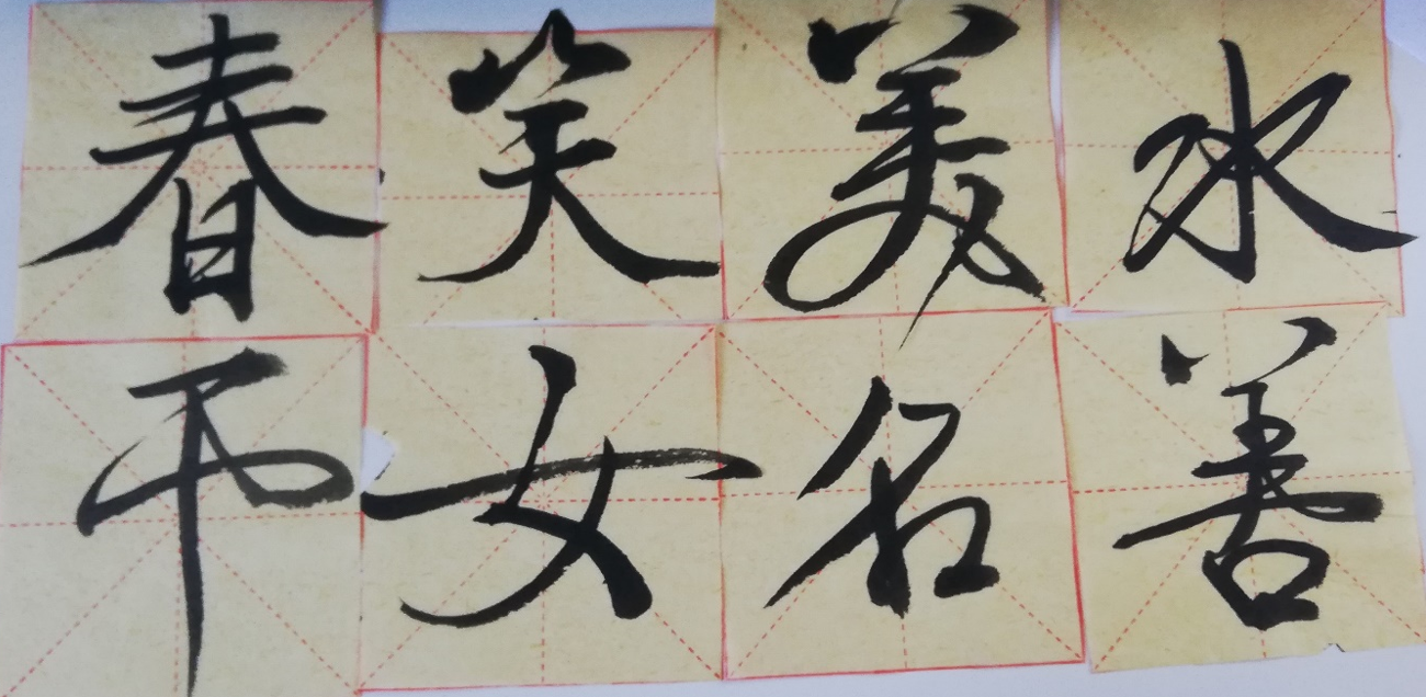 Ami még az írásjegyek szeretetéhez tartozik az az írásgyakorlás szeretete. Aki már részt vett kalligráfia órán, találkozott azzal, hogy mennyire nehéz az ecsetet úgy mozgatni, hogy pont olyan szögben, vastagságban és alakban jelenjen meg az adott vonás a papíron, ahogy azt szeretnénk. Ugyan ceruzával vagy tollal gyakorolva ennél jóval könnyebb dolgunk van, de ahhoz, hogy szép és arányos is legyen az a karakter, meg kell tanulnunk, melyik vonás milyen hosszú és mennyire dől vagy éppen egyenes. Szerencsére a gyakorlópapírokon be vannak húzva az átlók a kis négyzetekben, amikbe írunk, de az átlókba elhelyezni sem olyan egyszerű minden vonást, hát még egy sima lapra ugyanolyan arányosan leírni, mint a hálóba. Ezzel együtt néha én is rajtakapom magam, hogy egy-egy végigdolgozott nap után még egy fél órára leülök, és valami nyugis zene mellett írok néhány sor írásjegyet. Meglepően élvezetes elfoglaltság tud ez lenni, aki már próbálta, az tudja, miről beszélek. Én magam ugyan sosem voltam túl jó kalligráfiában, de ettől még szeretem, és szeretném egyszer igazán jól megtanulni. Találtam pár jobban sikerült példányt, de ha valaki kisegít és hozzájárul, hogy az ő kalligráfiája szerepeljen itt, szívesen beteszem! :D A képen látható írásjegyek egy szabadabb, ún. 行书 xíngshū stílusban készültek, én ebbe kóstoltam bele Kínában annak idején.